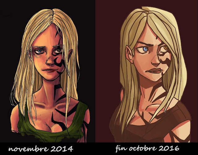Bon là j'ai pas l'impression d'avoir fait de très gros progrès en painting, mais j'pense que niveau proportions des éléments du visage(les petites oreilles hahaha), anatomie, forme du visage(?) ça va mieux. En gros je trouve que sur la version 2016 elle a moins l'air d'avoir une face plate avec juste des yeux, un nez et une bouche qui se baladent au hasard dedans, par rapport à 2014.